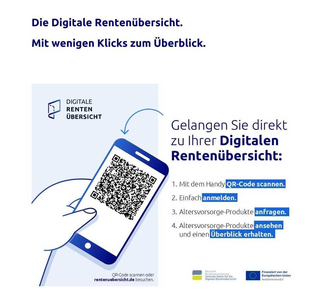 Die Deutsche Rentenversicherung stellt mit der "Digitalen Rentenübersicht" erstmalig eine kostenfrei nutzbare Plattform zur Verfügung, auf der Bürgerinnen und Bürger einen individuellen Gesamtüberblick über die eigenen gesetzlichen, betrieblichen und privaten Altersvorsorgeansprüche einsehen können. Die dafür benötigten Daten liefern alle Anbieter von Altersvorsorge-Produkten, die eine jährliche Standmitteilung verschicken und mehr als 1.000 Vorsorgeansprüche verwalten. Um die eigene Digitale Rentenübersicht abrufen zu können, sind die persönliche Steuer-ID sowie die Bestätigung der eigenen Identität erforderlich. Für den Identitätsnachweis benötigen Sie lediglich Ihren Online-Ausweis, die dazugehörige PIN, ein geeignetes Smartphone oder Tablet sowie die installierte AusweisApp. Falls Sie Ihre PIN nicht kennen, hilft Ihnen Ihr Bürgerbüro gern weiter. Verschaffen Sie sich jetzt einen Überblick auf www.rentenuebersicht.de und nutzen Sie die Digitale Rentenübersicht als Grundlage für Ihre Altersvorsorgeplanung.